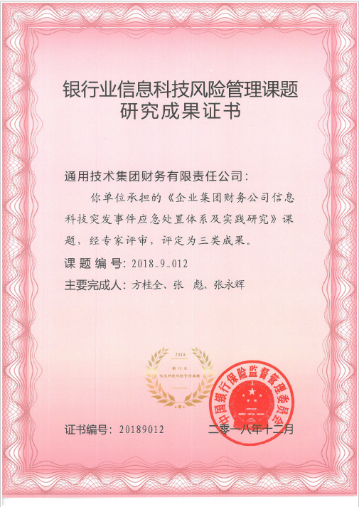 通用技术财务公司荣获2018年度银行业信息科技风险管理课题研究三类成果奖