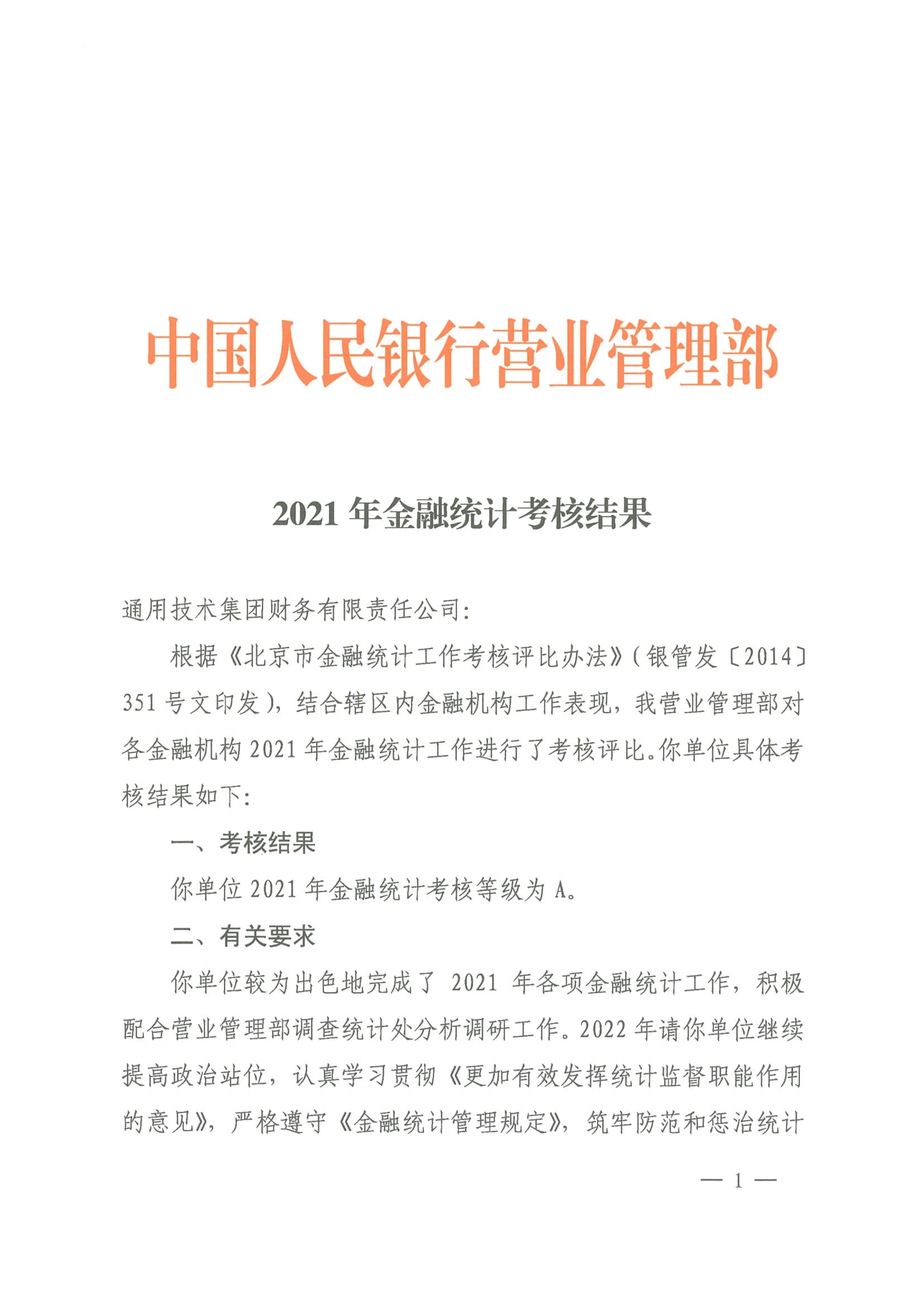 根据《北京市金融统计工作考核评比办法》(银管发〔2014〕351号),结合辖区内金融机构工作表现,人民银行营业管理部每年对辖内各金融机构的金融统计工作进行公开考核评比。2021年,通用技术财务公司金融统计考核等级评为A级,为考核评比的最高级别,这也是财务公司时隔四年再次获此殊荣。