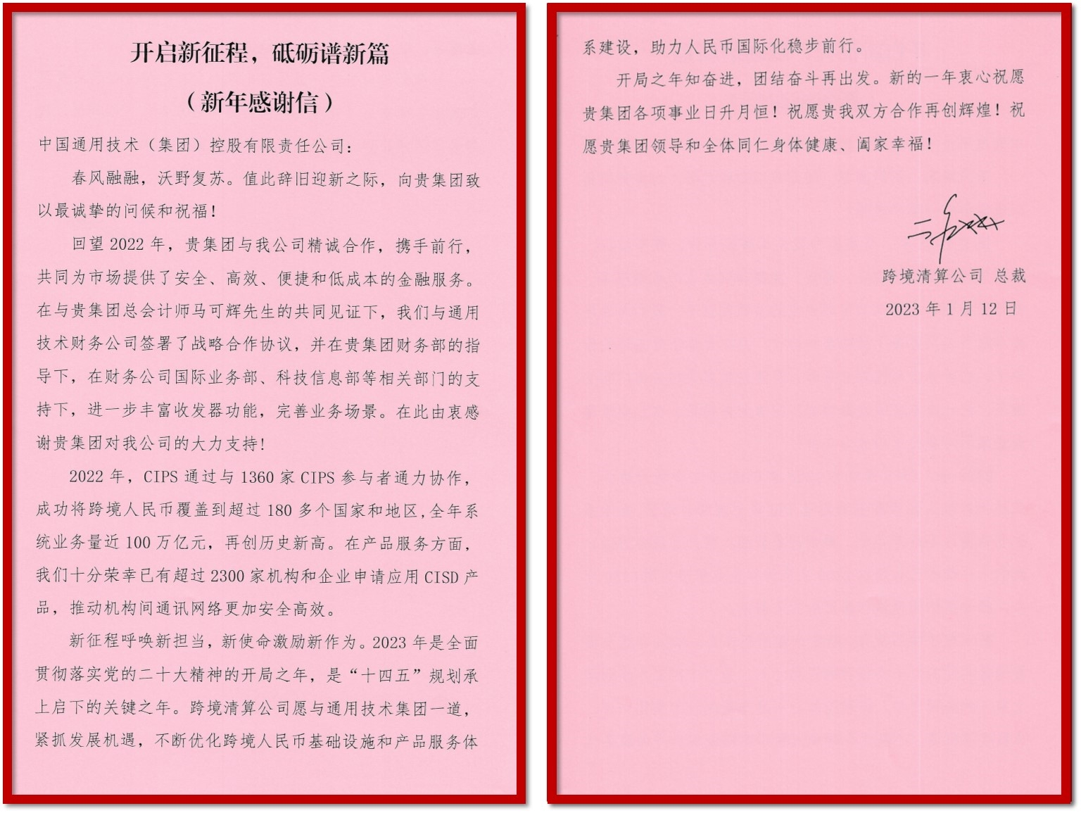 近日,跨境清算公司发来的新年感谢信,感谢通用技术集团与其在过去一年精诚合作,携手前行,共同为市场提供了安全、高效、便捷和低成本的金融服务。