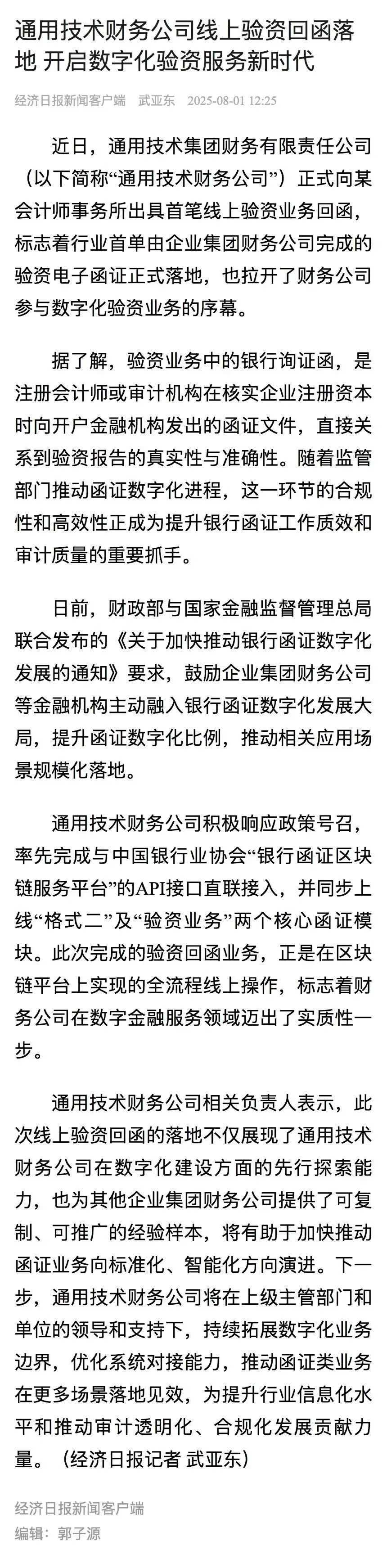 媒体聚焦 | 经济日报等报道通用技术财务公司落地行业首单验资回函