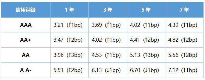 中债中短期票据AAA曲线5Y收益率下行0.23BP至3.9667%,中债企业债AAA曲线5Y收益率下行0.24BP至3.9664%,城投债AAA曲线5Y收益率下行3.09BP至4.0237%。